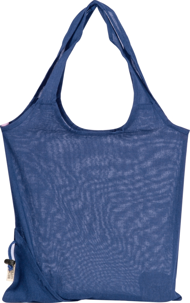 Shopping bag made of recycled cotton and polyester with a grammage of 118 g/m2. The bag can be folded up to save space. We print your logo on one side. Dimensions: 37 x 0,3 x 37 cm