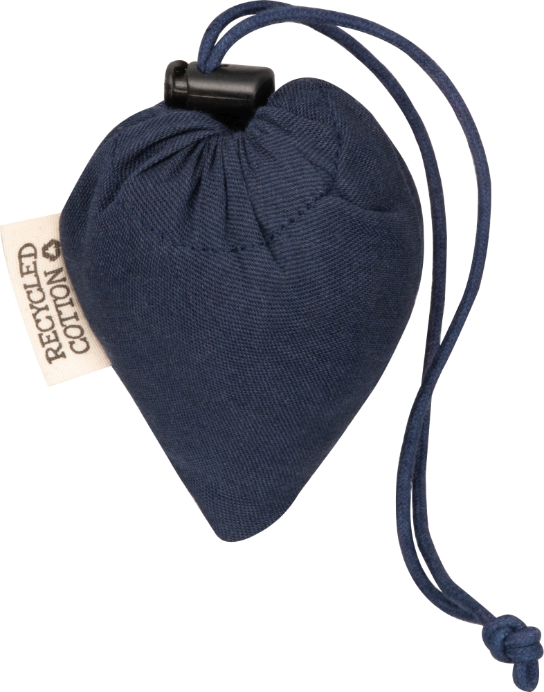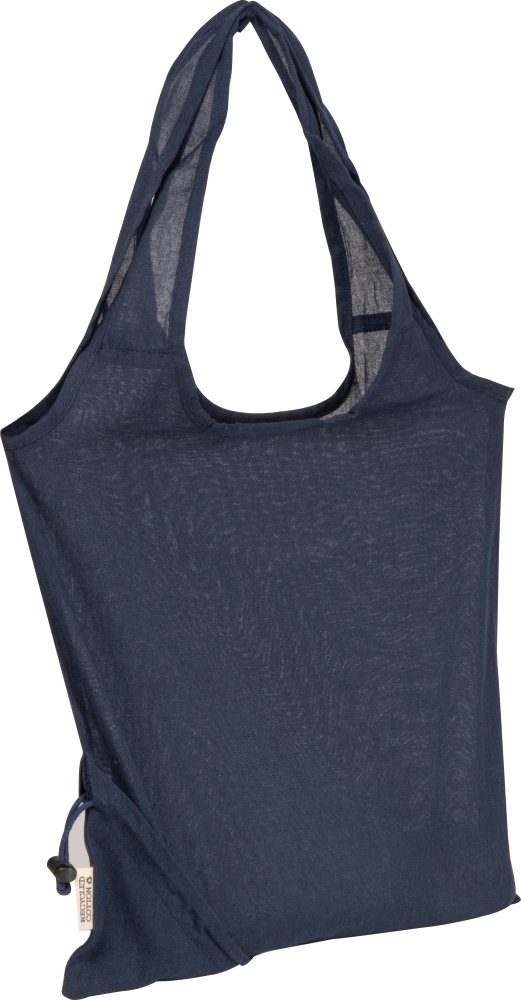 Shopping bag made of recycled cotton and polyester with a grammage of 118 g/m2. The bag can be folded up to save space. We print your logo on one side. Dimensions: 37 x 0,3 x 37 cm