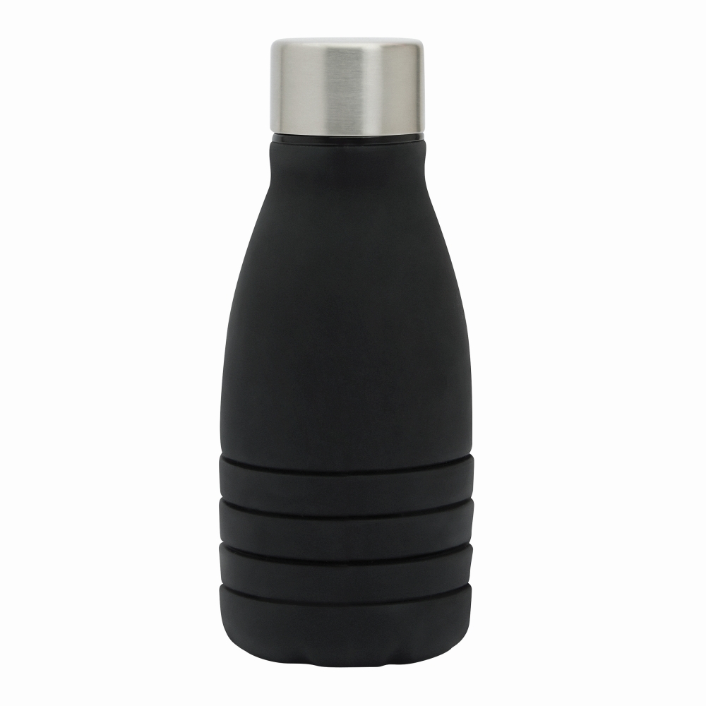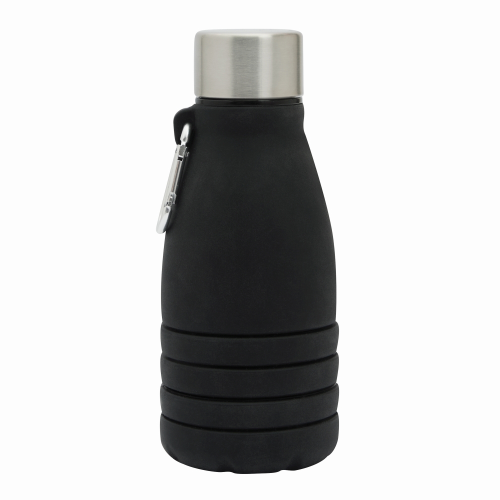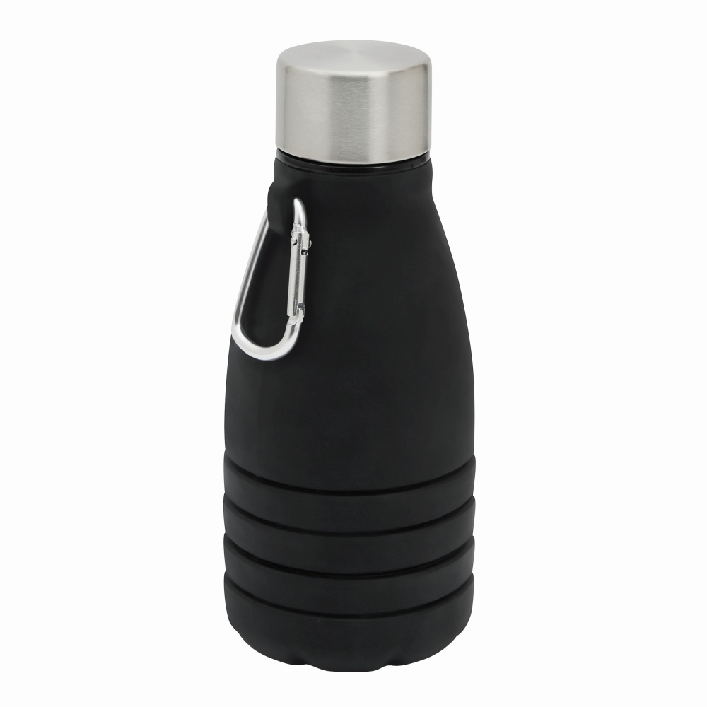 Collapsible drinking bottle, stainless steel cap with secure screw cap and silicone sealing ring, with aluminum carabiner (the carabiner is NOT suitable for climbing), the bottle can be extended and folded by approx. 8 cm, capacity approx. 550 ml. Dimensions: O7.5 x 17-25 cm