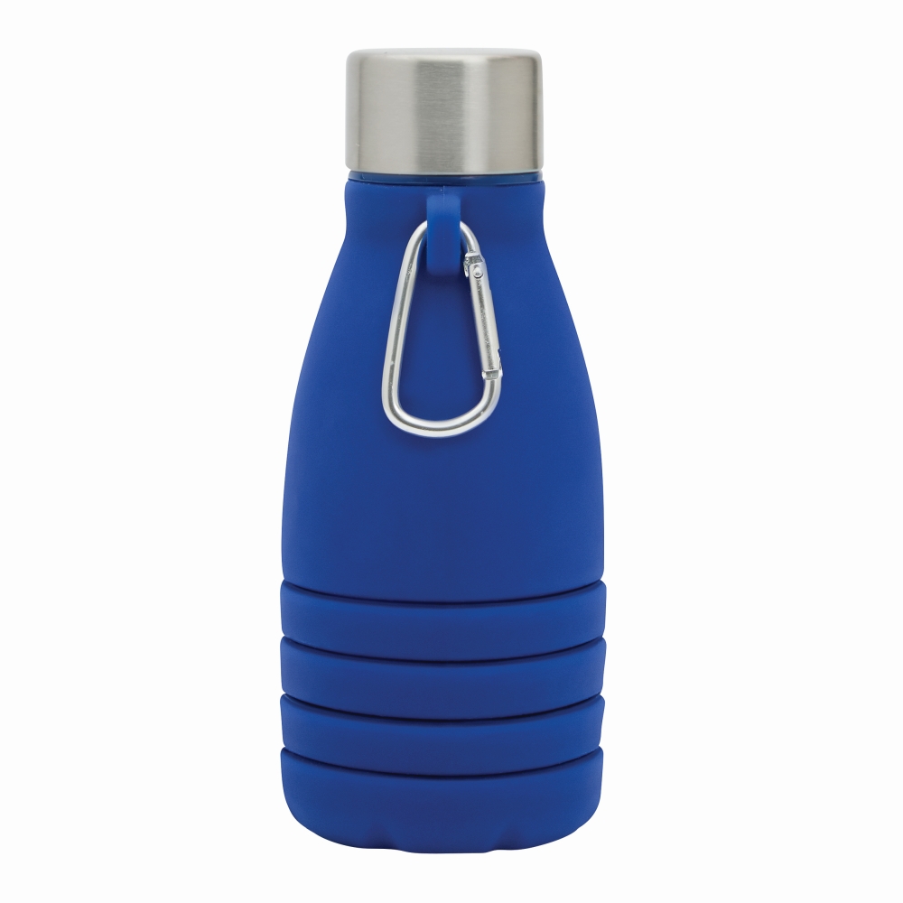 Collapsible drinking bottle, stainless steel cap with secure screw cap and silicone sealing ring, with aluminum carabiner (the carabiner is NOT suitable for climbing), the bottle can be extended and folded by approx. 8 cm, capacity approx. 550 ml. Dimensions: O7.5 x 17-25 cm