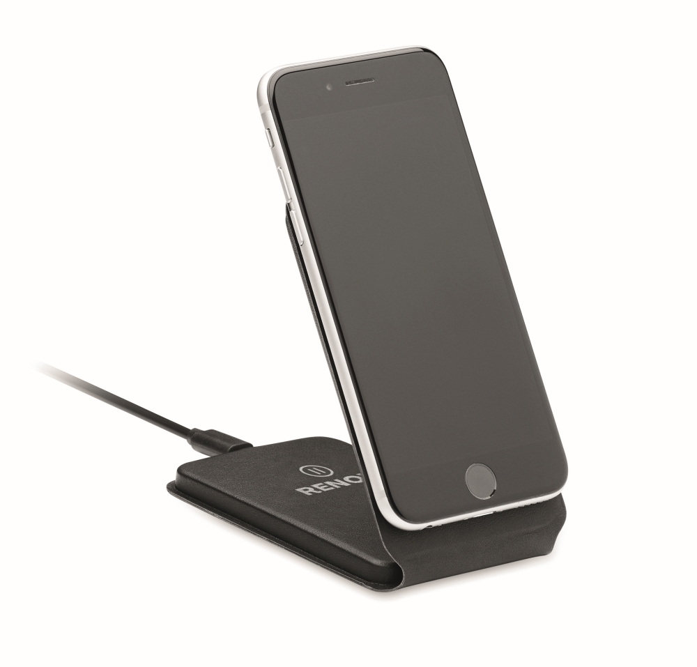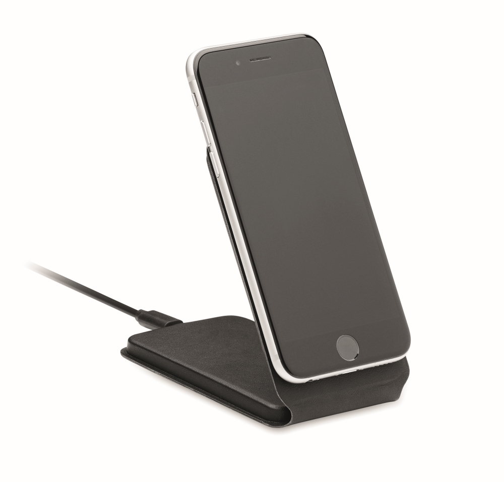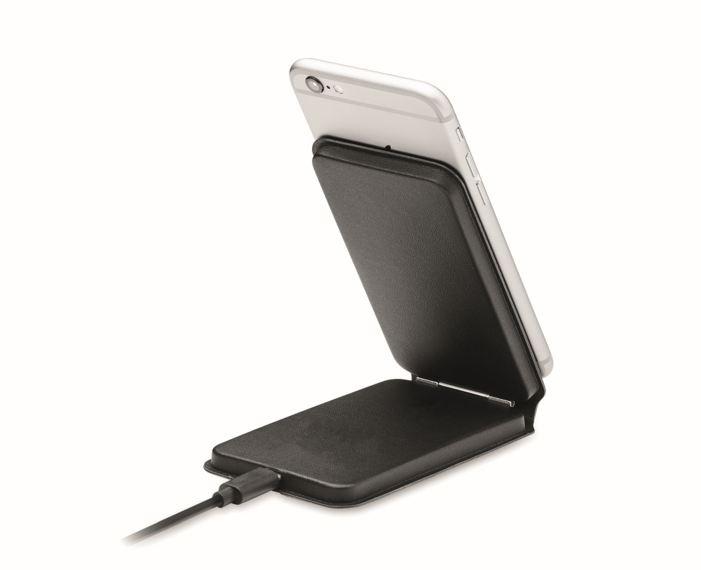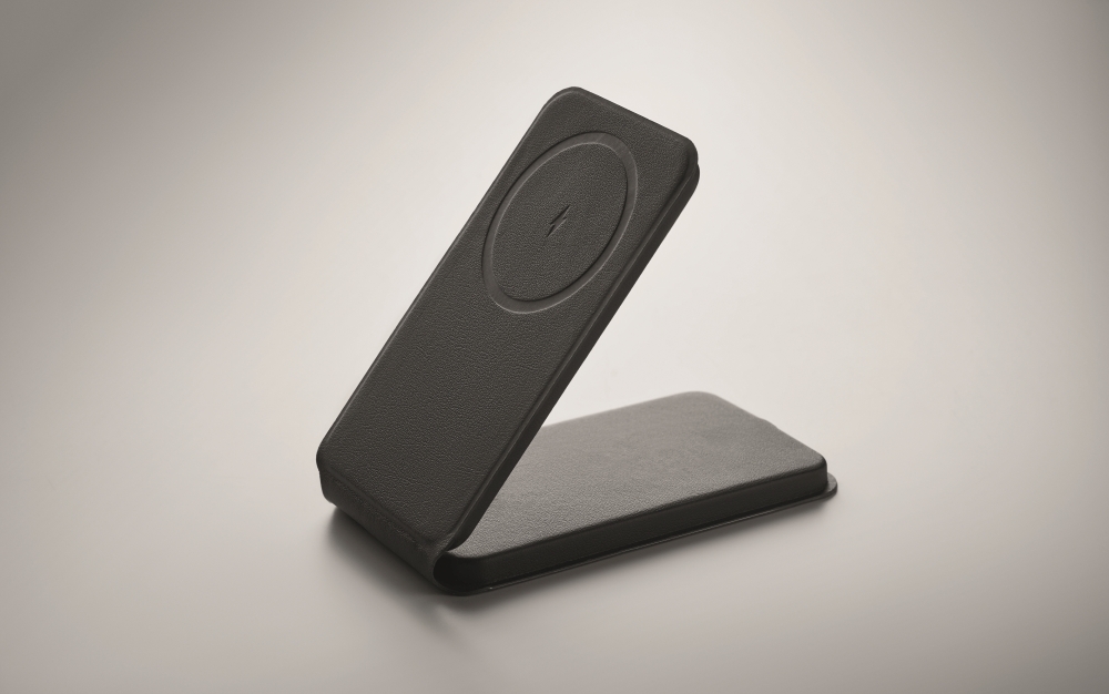 Foldable wireless charger 15W with magnetic phone stand in 58% recycled polyester and 42% PU. Dimensions: 11,4 x 6,5 x 1,3 cm