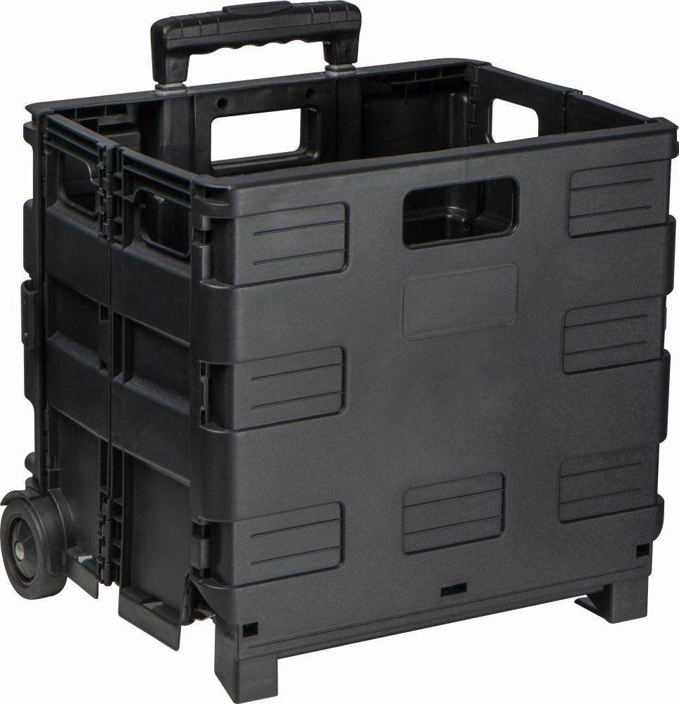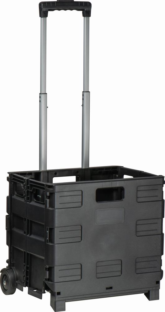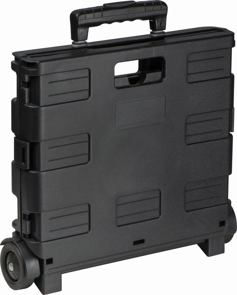 Folding plastic shopping trolley with extendable handle and 32 litre capacity. This makes it easy to transport your shopping. We will print your logo on the front.