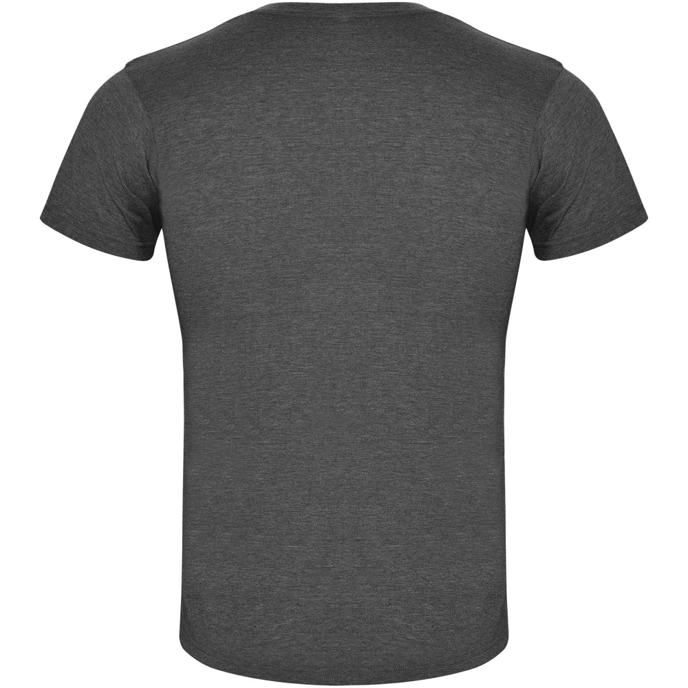 Short-sleeve t-shirt with heathered effect. 1x1 ribbed crew neck with interior reinforced covered seams. Tubular fabric. Removable label.