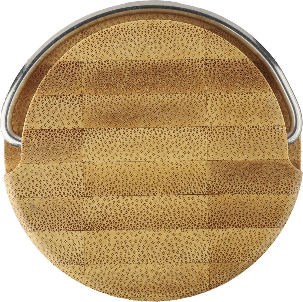 Glass drinking bottle (500 ml) with bamboo lid and metal carrying handle. Individually packaged in a brown cardboard box. Dimensions: 6 x 20,5 cm