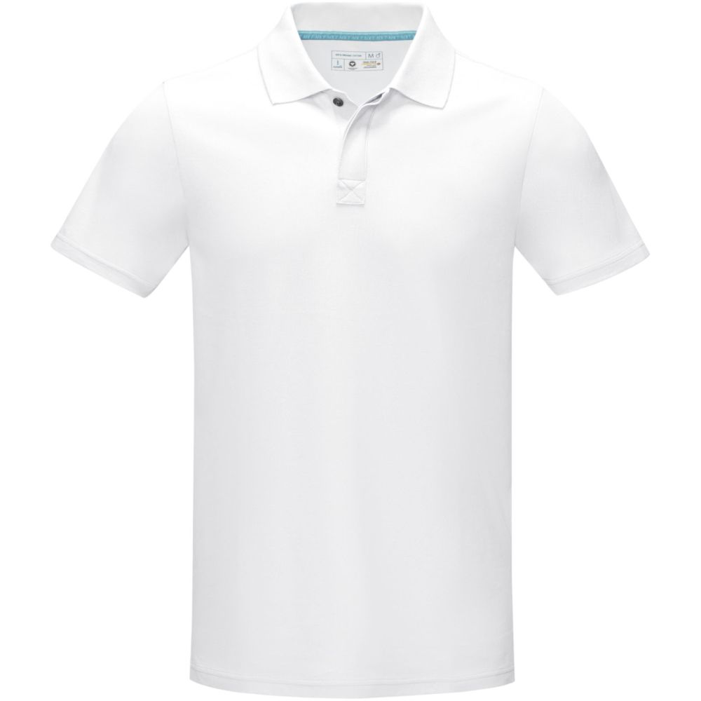 Sustainable promotional apparel. Sustainable metal buttons. Hidden three button placket. Flat knit collar. Bi-coloured branded necktape. Side slits with bi-coloured branded tape finishing. Half moon. Heat transfer main label for tagless comfort.
