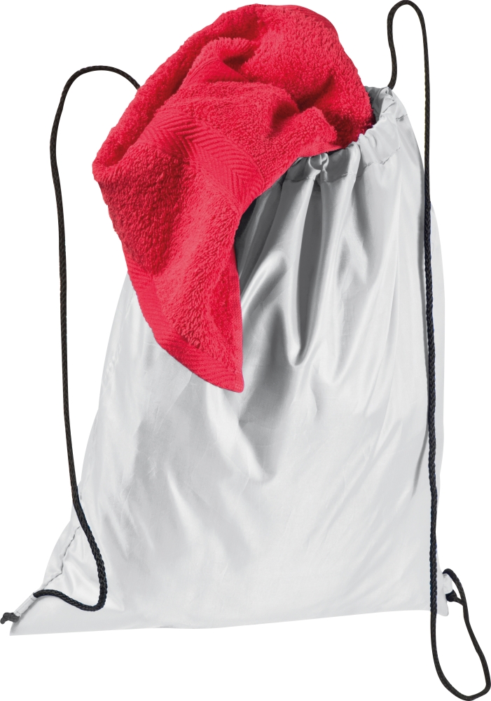Gymbag made of 210D recycled polyester with 2 side cords as carrying straps. There are countless possible uses, e.g. as a gym bag or laundry bag. We will print your logo on one side. Dimensions: