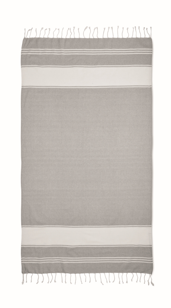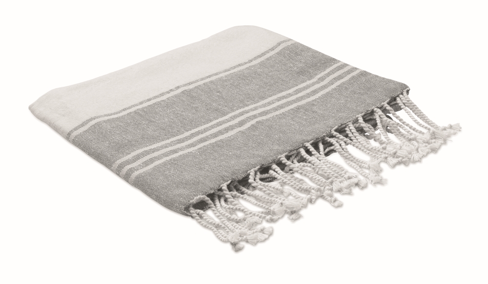 Set of hammam beach towel with drawstring bag. 70% recycled cotton and 30% recycled polyester 180 gr/m2. 90x160 cm. Dimensions: 90 x 160 cm