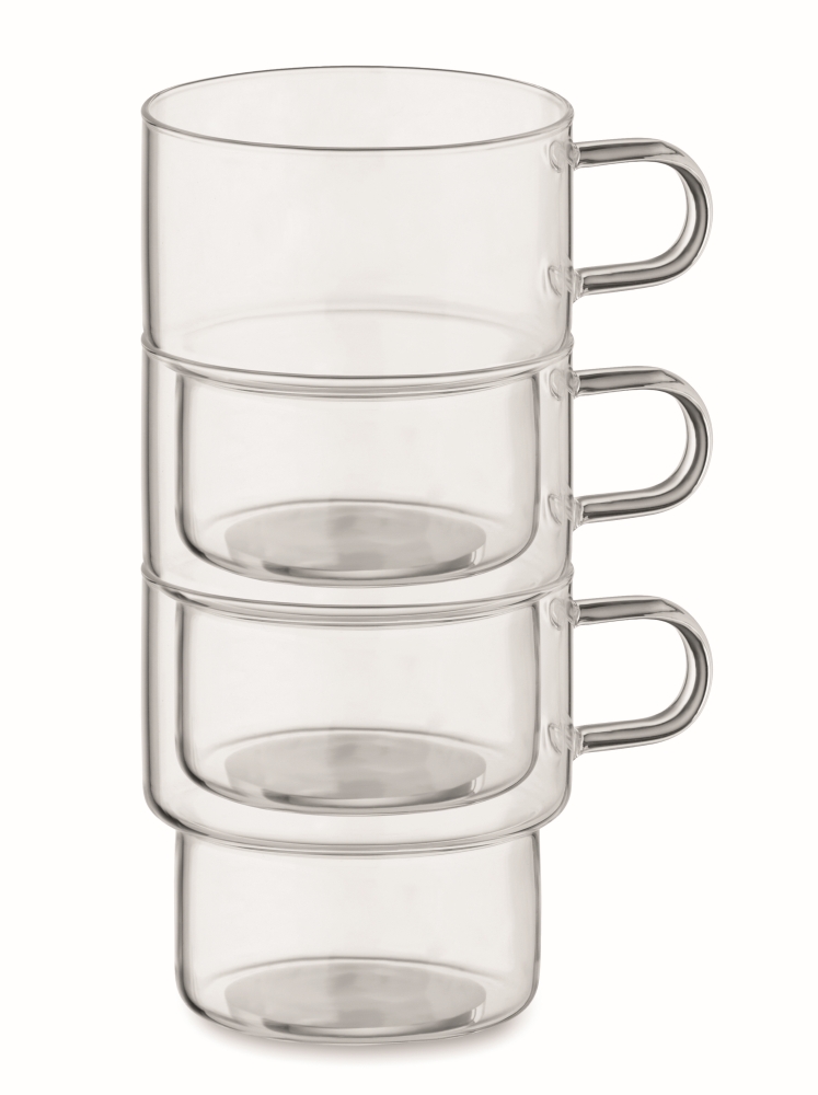 High borosilicate glass stackable mug. Capacity: 300 ml Dimensions: 10,5 x 8 cm