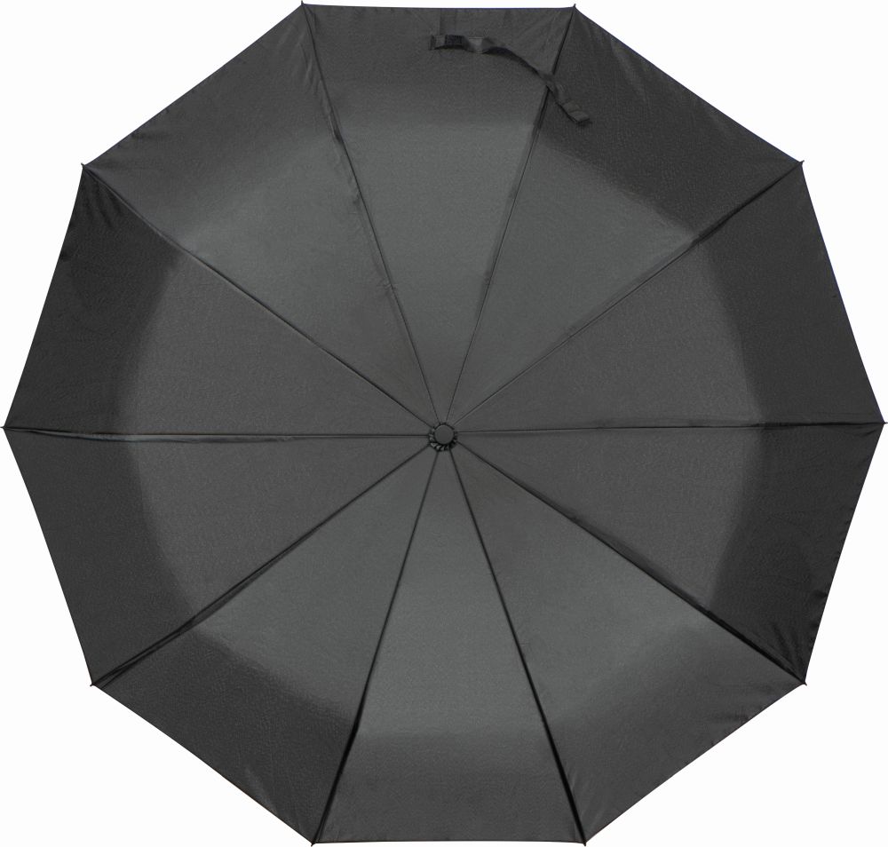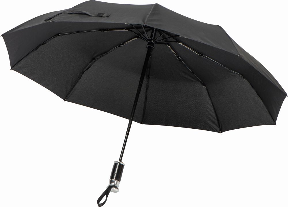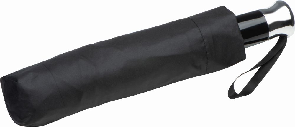 High-quality pocket umbrella made of 190T pongee with black fibreglass shaft, elegant handle and matching case. Automatic opening and closing at the touch of a button. We print your logo on one segment.