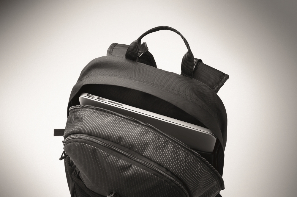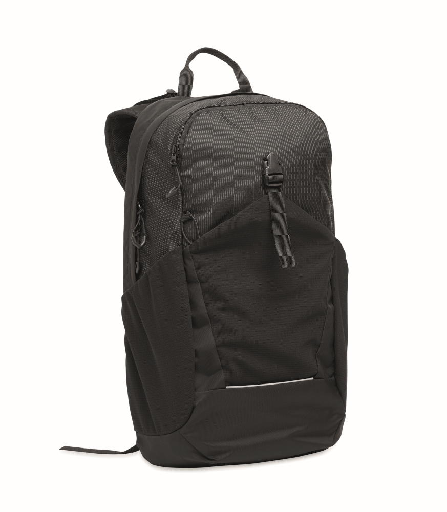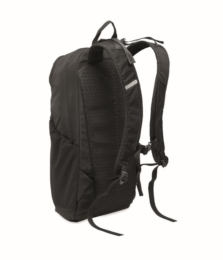 Hiking backpack 18L in water repellent 420D nylon with reflective stripe. It has a 15 inch laptop compartment. One front zippered compartment and one front slide pockets with buckle closure. Two side slide pockets. Padded back and shoulder straps. Ventilated back side. Dimensions: 29,5 x 11 x 50 cm