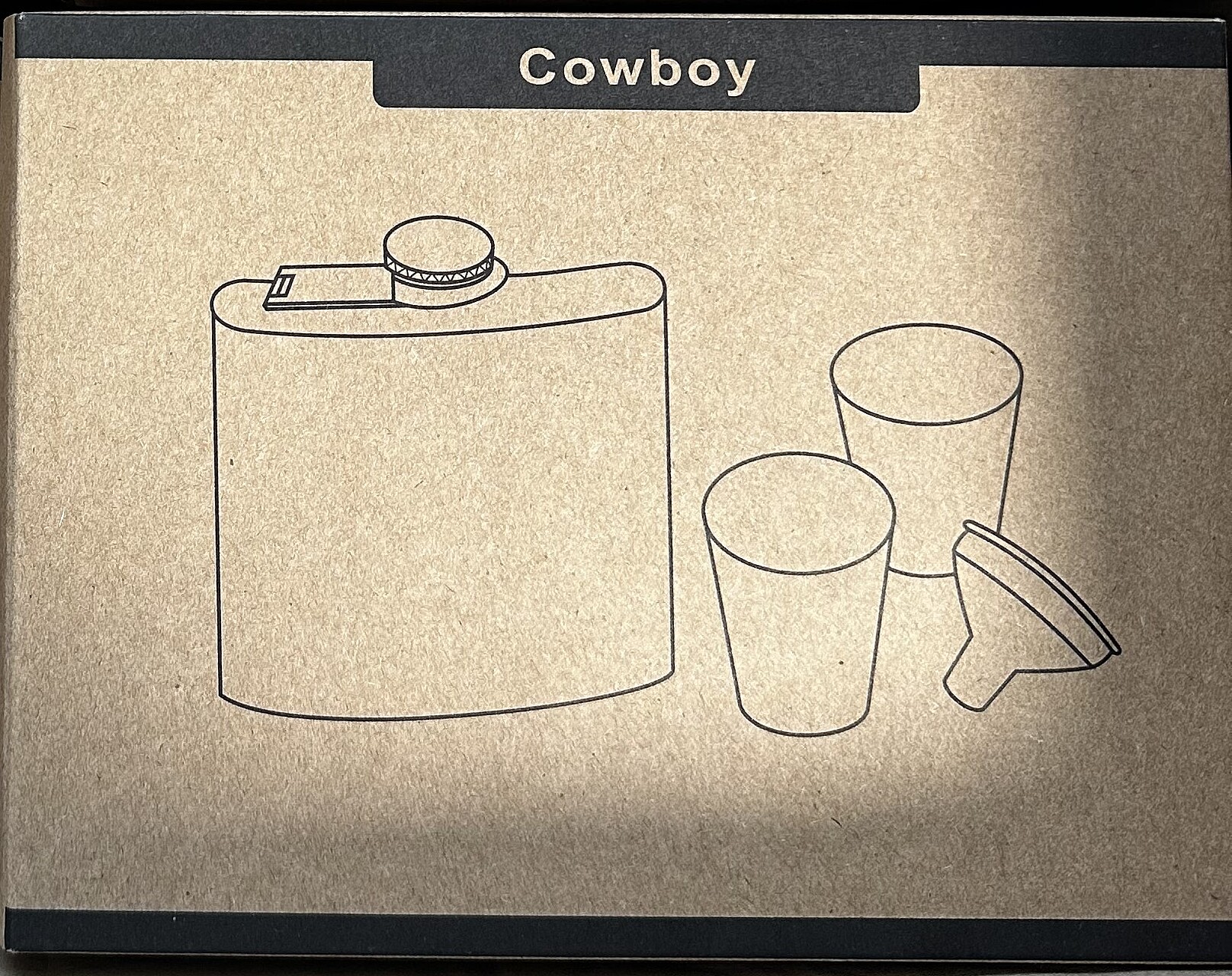 Hip flask "Cowboy" consists of flask (approx. 150 ml capacity), funnel and 2 cups, packed in a box. Colour: silver Product size: 9 x 10 x 2 cm