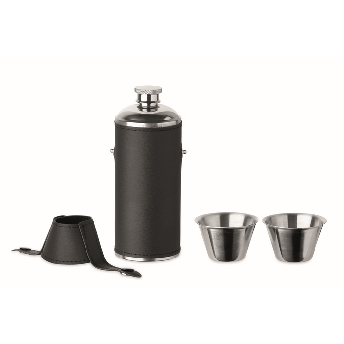Hip Flask in stainless steel with PU Leather surface and 2 pieces stainless steel 20ml shot cups in lid. Capacity: 230ml.Dimensions: O5,2 x 14,7cm
