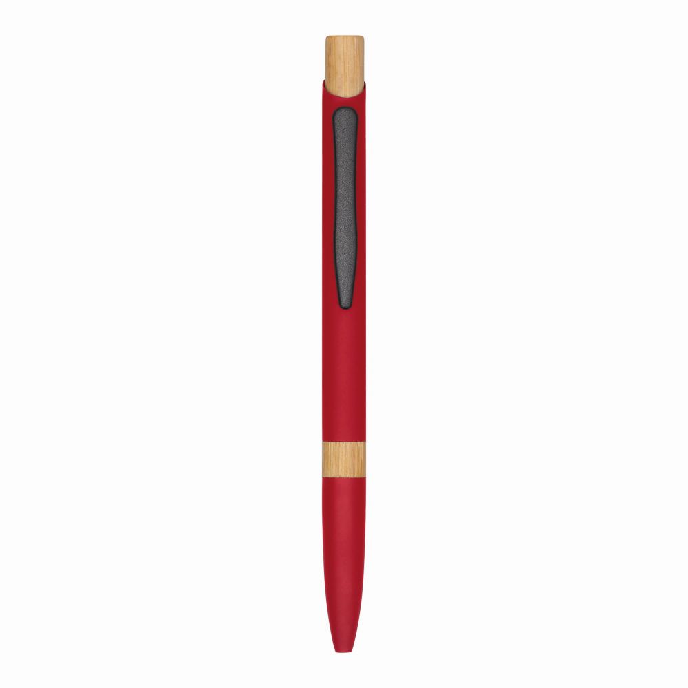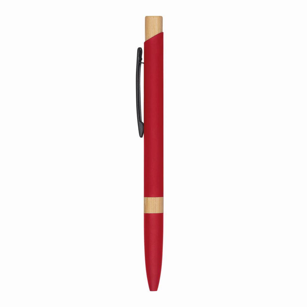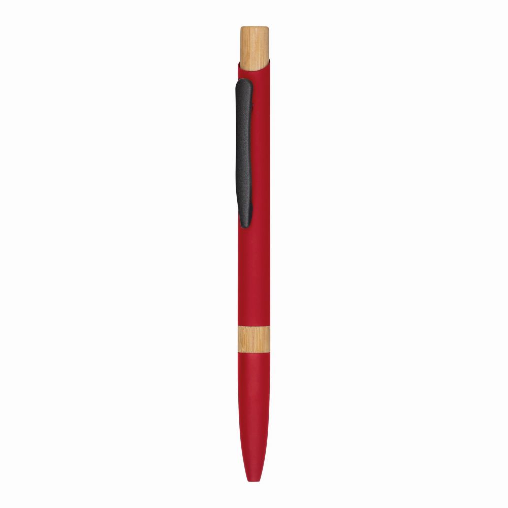Aluminium ballpoint pen: matt metal barrel, bamboo ring in grip area and bamboo push-button, pressure mechanism, large refill with blue ink. Dimension: 14 cm