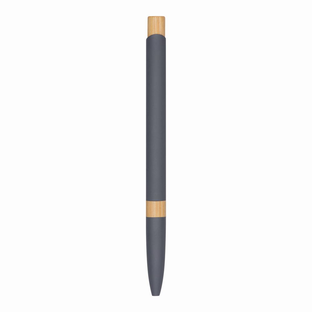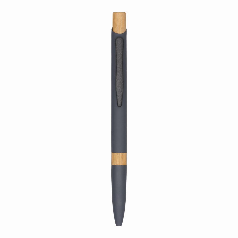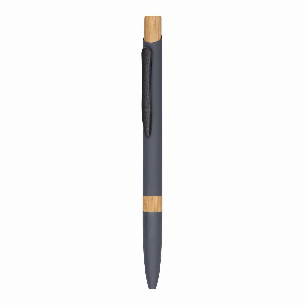 Aluminium ballpoint pen: matt metal barrel, bamboo ring in grip area and bamboo push-button, pressure mechanism, large refill with blue ink. Dimension: 14 cm