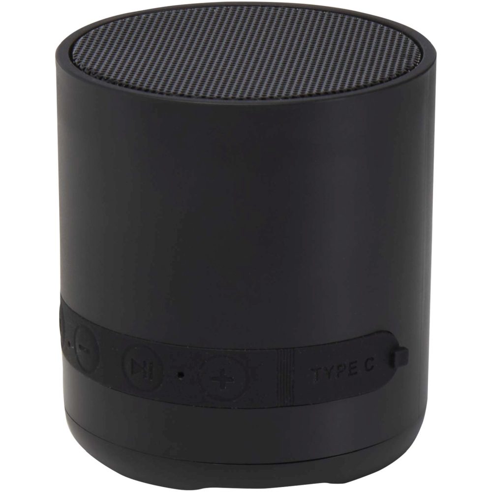The Hunor 3W wireless Bluetooth® speaker is made from recycled plastic, and features a Type-C charging port, volume controls, a Play/Pause/Call button, and a built-in microphone. Thanks to the TWS (True Wireless Stereo) functionality, you can pair two speakers for a stereo sound experience. Dimensions: 6 x 6,8 cm