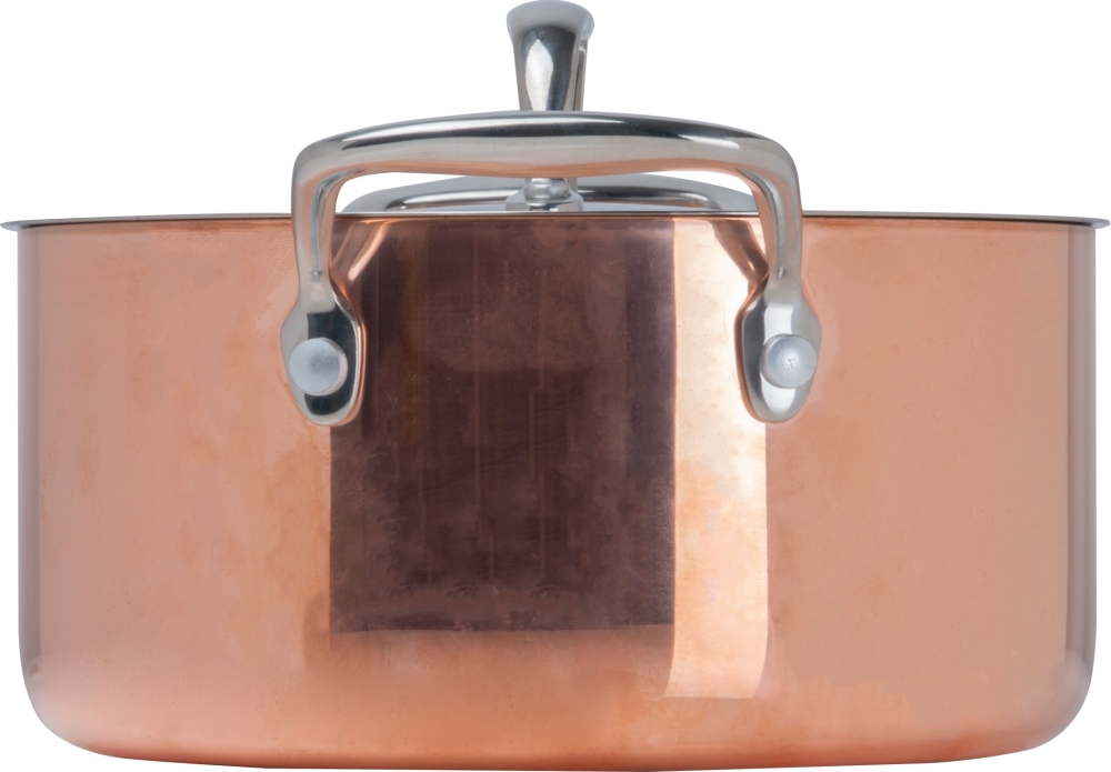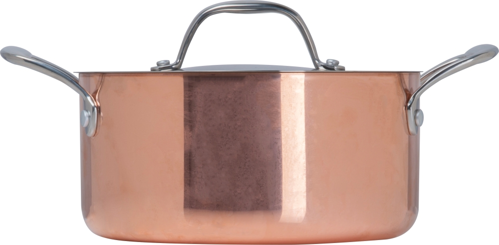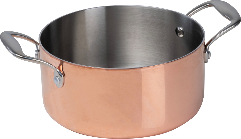Cooking pot made of stainless steel and copper coating with lid and two handles. Suitable for electric, gas and induction cookers. The copper coating guarantees the best heat conductivity and storage capacity. We will engrave your logo on the lid. Dimensions: o 20,5 x 10,5 cm