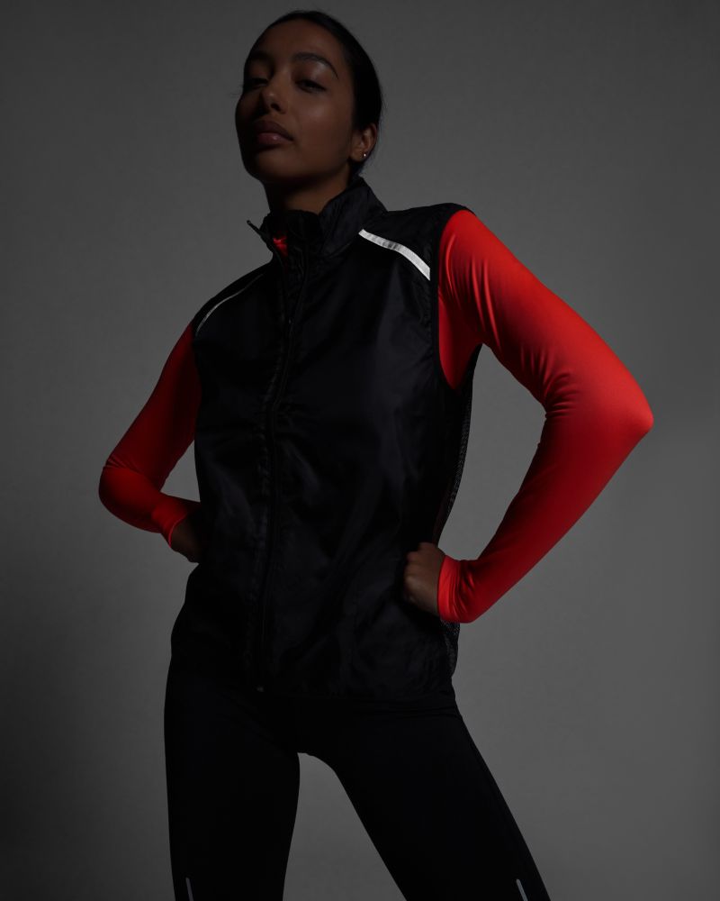Wind-proof and breathable. Front zip with matching chin protector. Elastic binding at armhole and bottom. Bottom part of the back in microperforated fabric. High-visibility details on the top, front and back. Pocket with elastic strap to stow the vest and wear it on the wrist. Removable label. 100% Polyester, 70 g/m2, Contrast fabric, Mesh with cool fit finish of 100% Polyester, 70 g/m2.