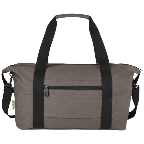 Composed with highly durable and sustainable materials, GRS recycled canvas and GRS RPET lining, the 25 litre Joey sports duffel bag features a spacious zippered main compartment with an inner zippered pocket for safekeeping. It also has 1 open front pocket and another strap zippered pocket on the back for trolley, and it can be carried either by reinforced webbing handles or the detachable and adjustable shoulder strap for comfort. The decorative metal plate can make a logo shine through its subtle and matt finish.