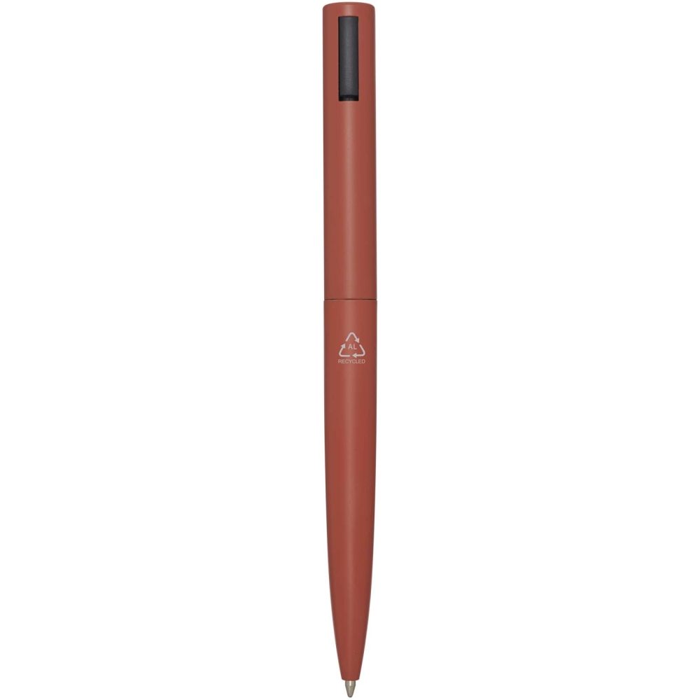 Ballpoint pen with the upper barrel made of recycled plastic, and the lower part is made of recycled aluminium. The clip is made of iron. Ink colour: Blue. Writing length: 1000 metres. Nib size: 1.0 mm. Dimensions: 14,5 x O 1,5 cm