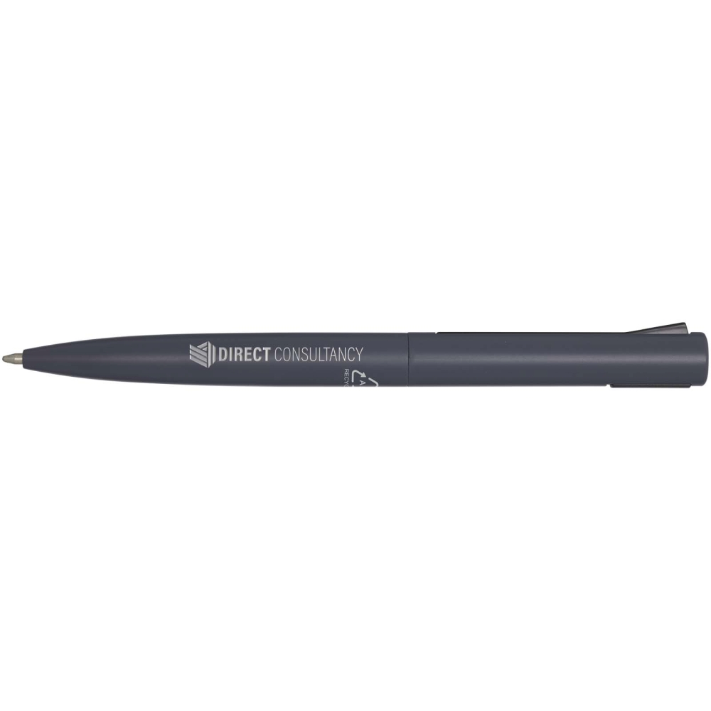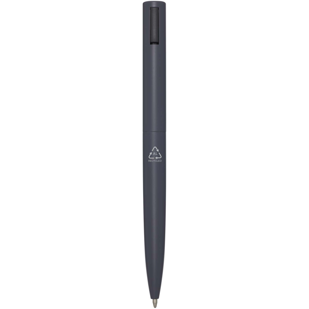 Ballpoint pen with the upper barrel made of recycled plastic, and the lower part is made of recycled aluminium. The clip is made of iron. Ink colour: Blue. Writing length: 1000 metres. Nib size: 1.0 mm. Dimensions: 14,5 x O 1,5 cm