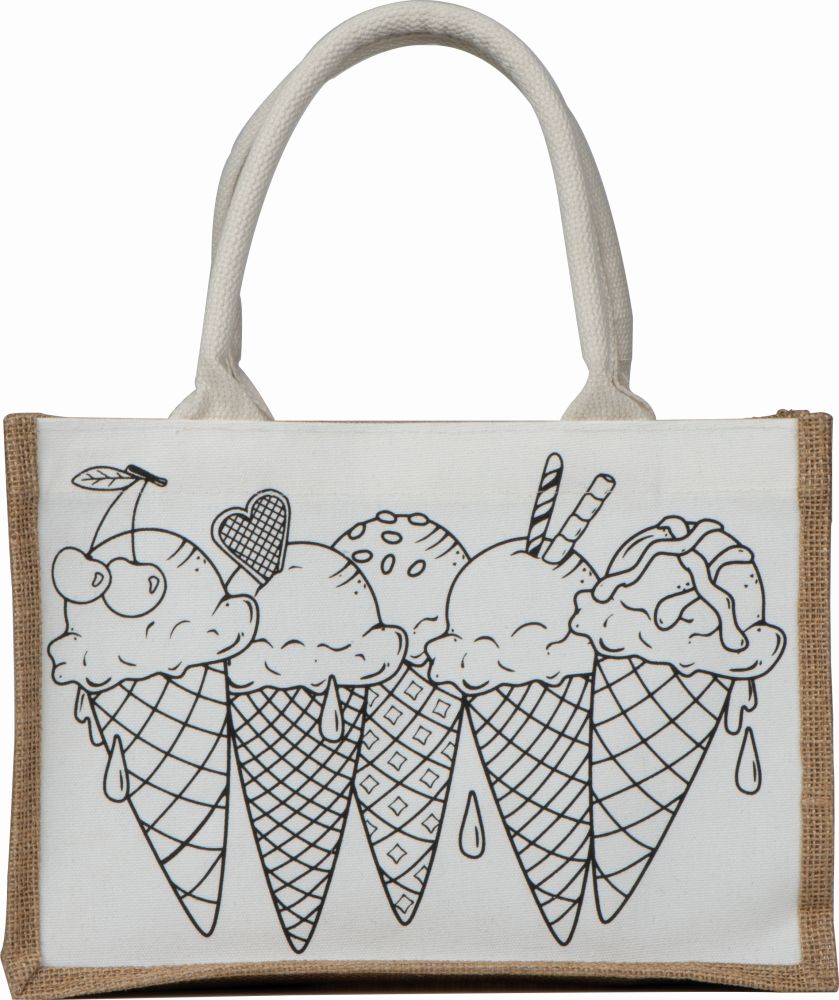 Jute bag for children to colour in. A motif is printed on the front, which can be coloured in with the six wax crayons included. We will print your logo on the back.