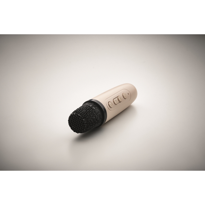 Karaoke set including 5W wireless speaker with LED changing colours light in recycled ABS with PU handle and microphone. Built-In 800 mAh battery speaker and 400 mAh battery microphone. Playing time approx. 3h.Dimensions: 8.5 x 9 x 6.5cm