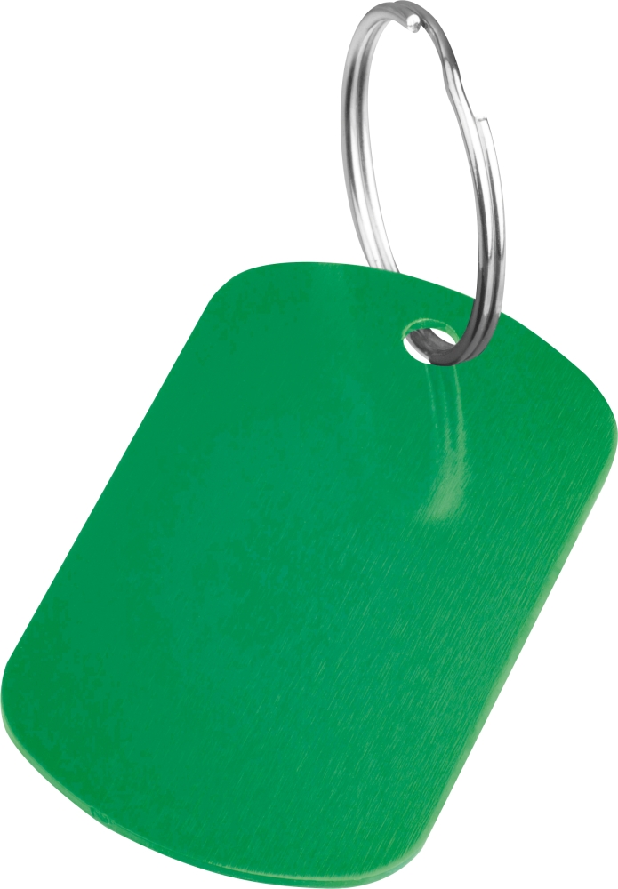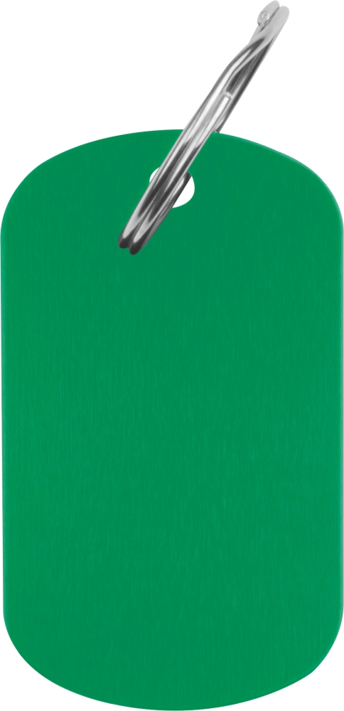 Stylish key fob made from recycled aluminium in the fashionable design of a dog tag. We engrave your logo on the metal plate. Dimensions: 4,8 x 2,9 x 0,2 cm