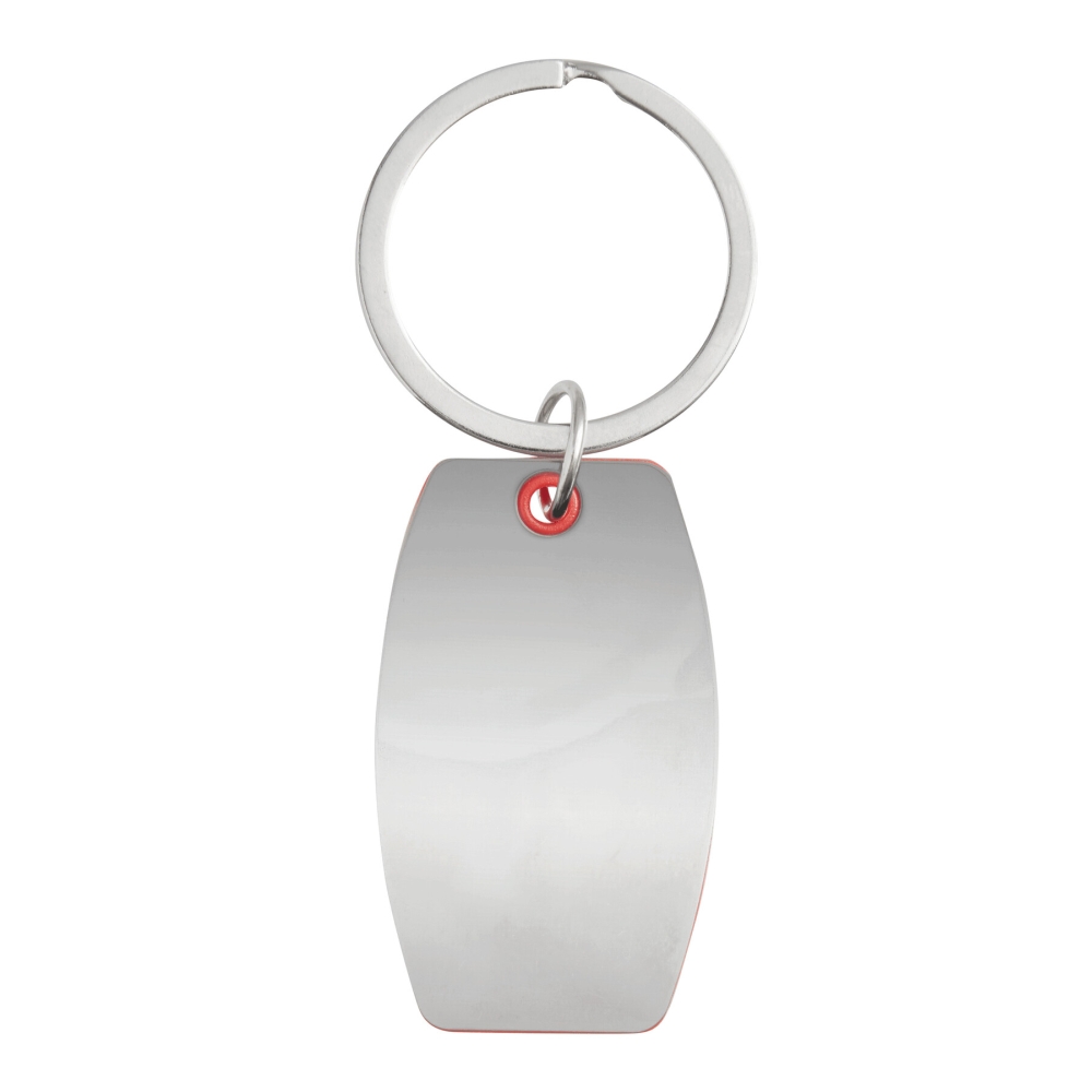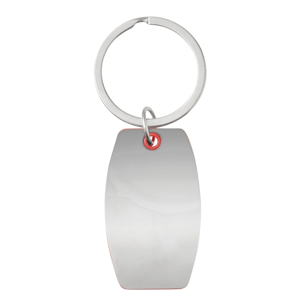 Key ring: coloured plastic piece between high gloss polished steel. Dimensions: 7 x 3 x 0,4 cm