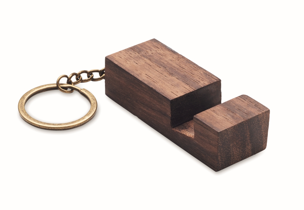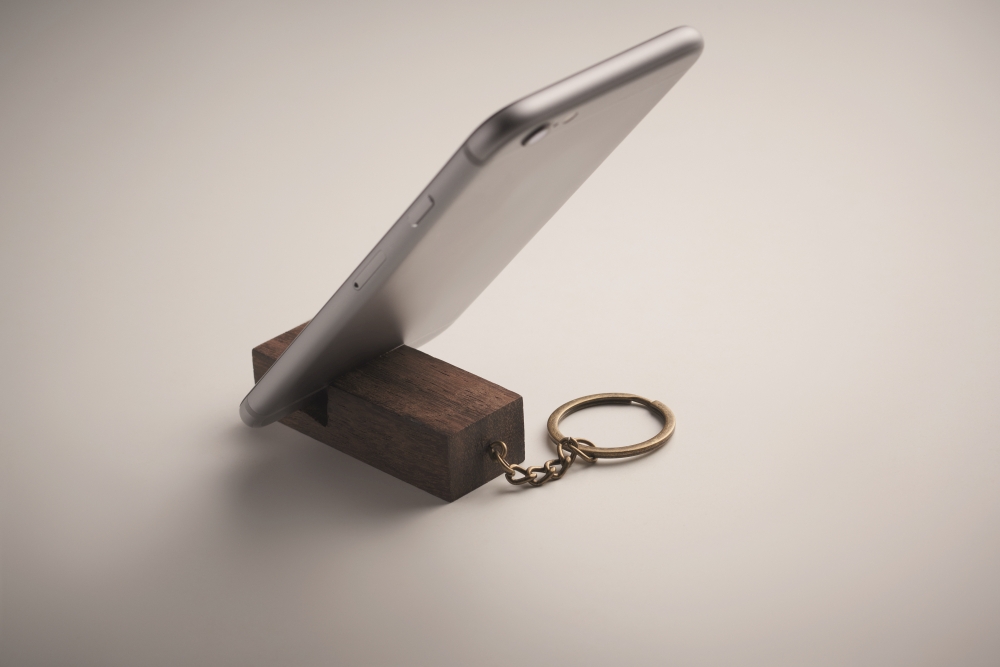 Key ring with phone stand in walnut wood. Dimensions: 5,9 x 1,9 x 1,5 cm