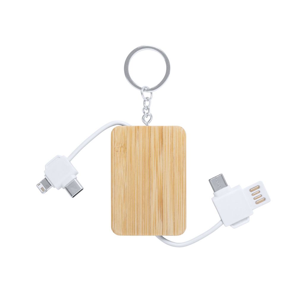Bamboo keyring USB charger cable with micro USB, USB-C and Lightning connectors. With USB and USB-C inputs.