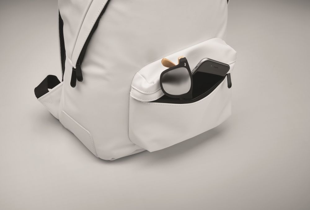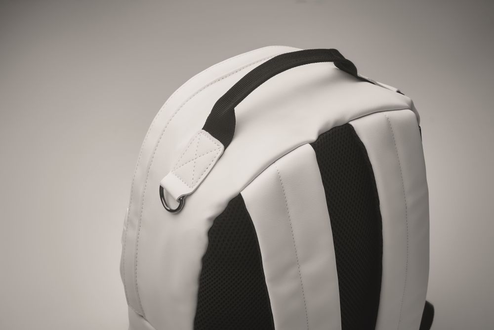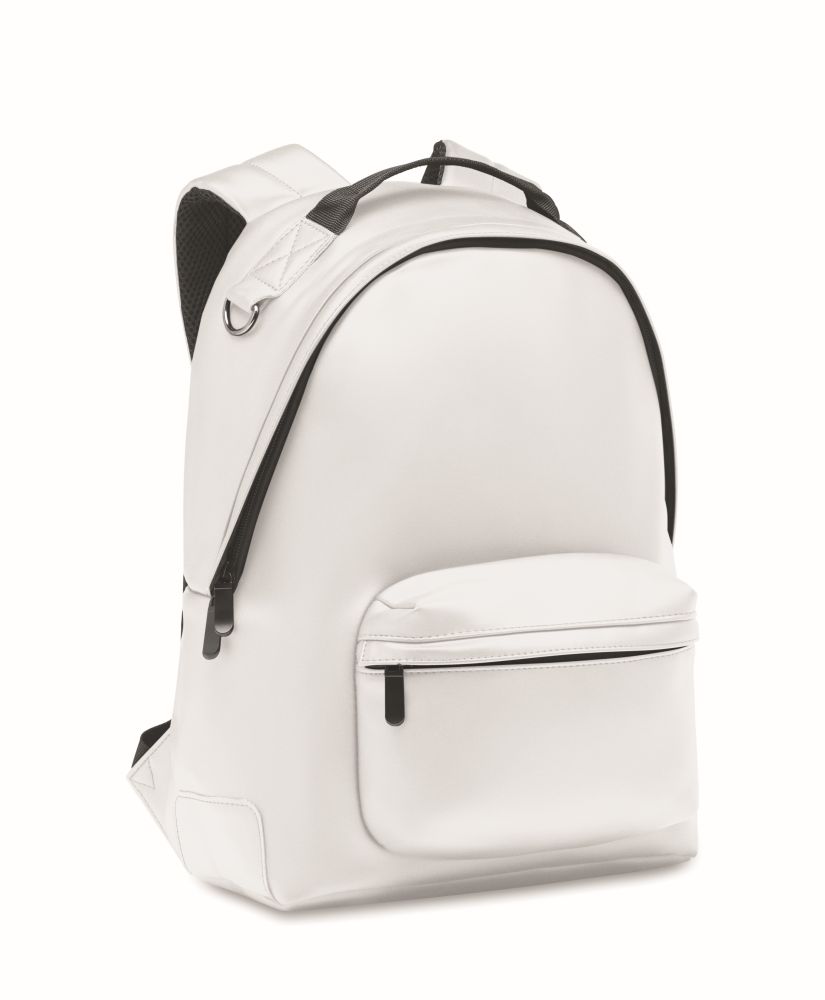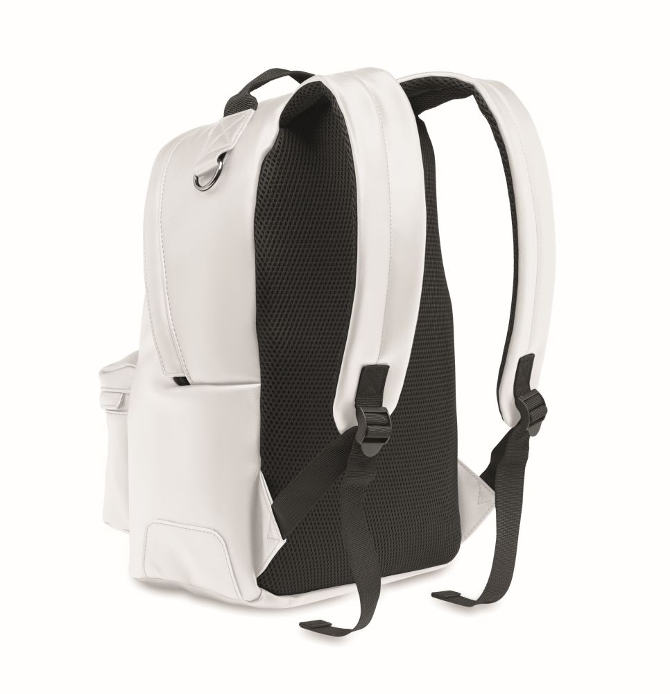 15 inch laptop backpack in soft PU with padded back and reinforced base. Front zipped pocket. The lining is 210D RPET.