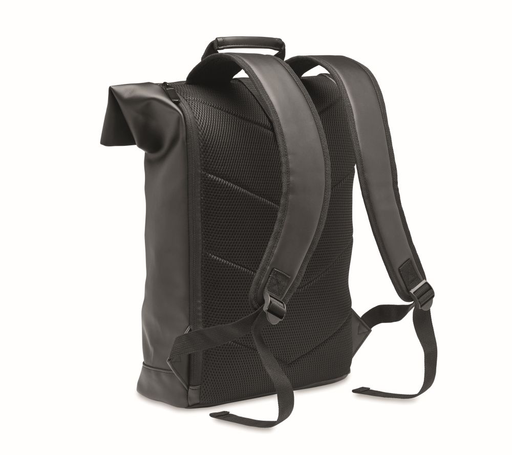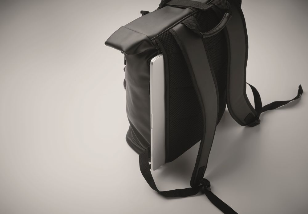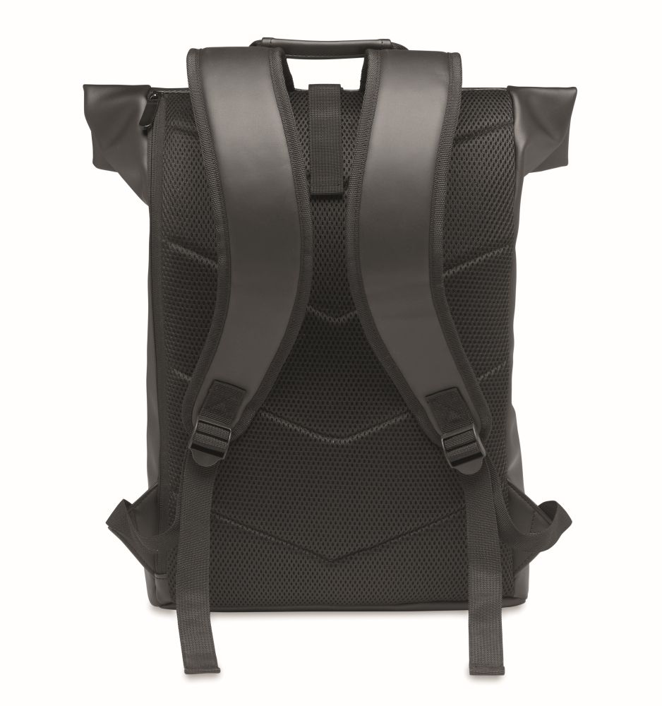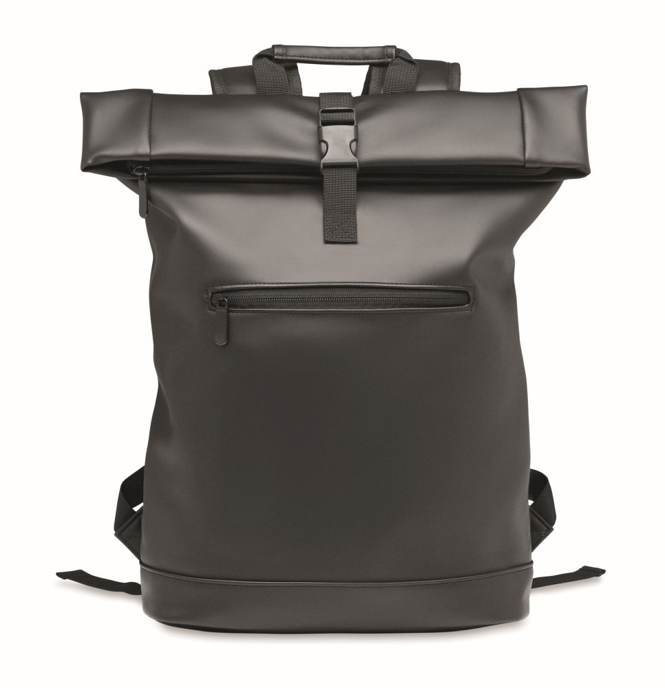 15 inch rolltop laptop backpack in soft PU with padded back and reinforced base. Large front zipped pocket. The lining is 210D RPET.