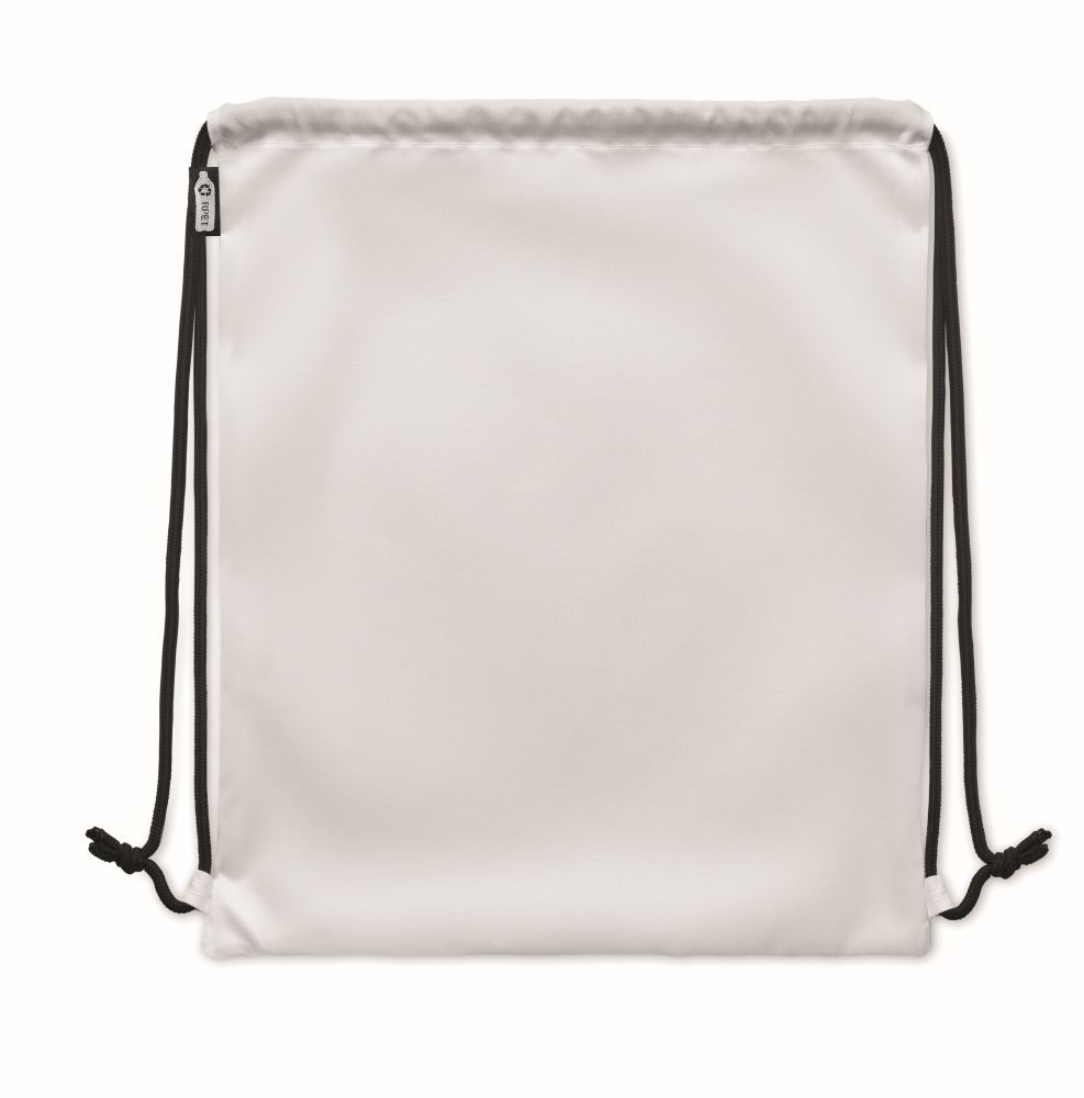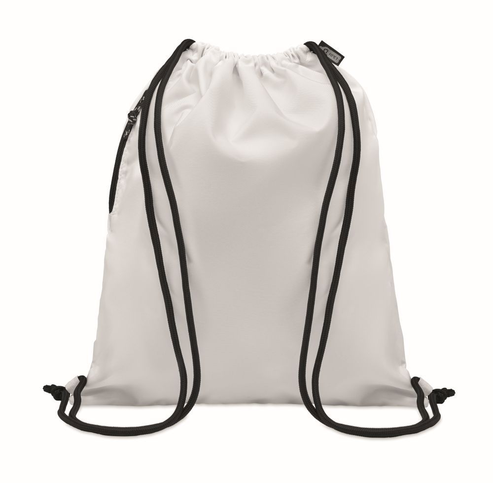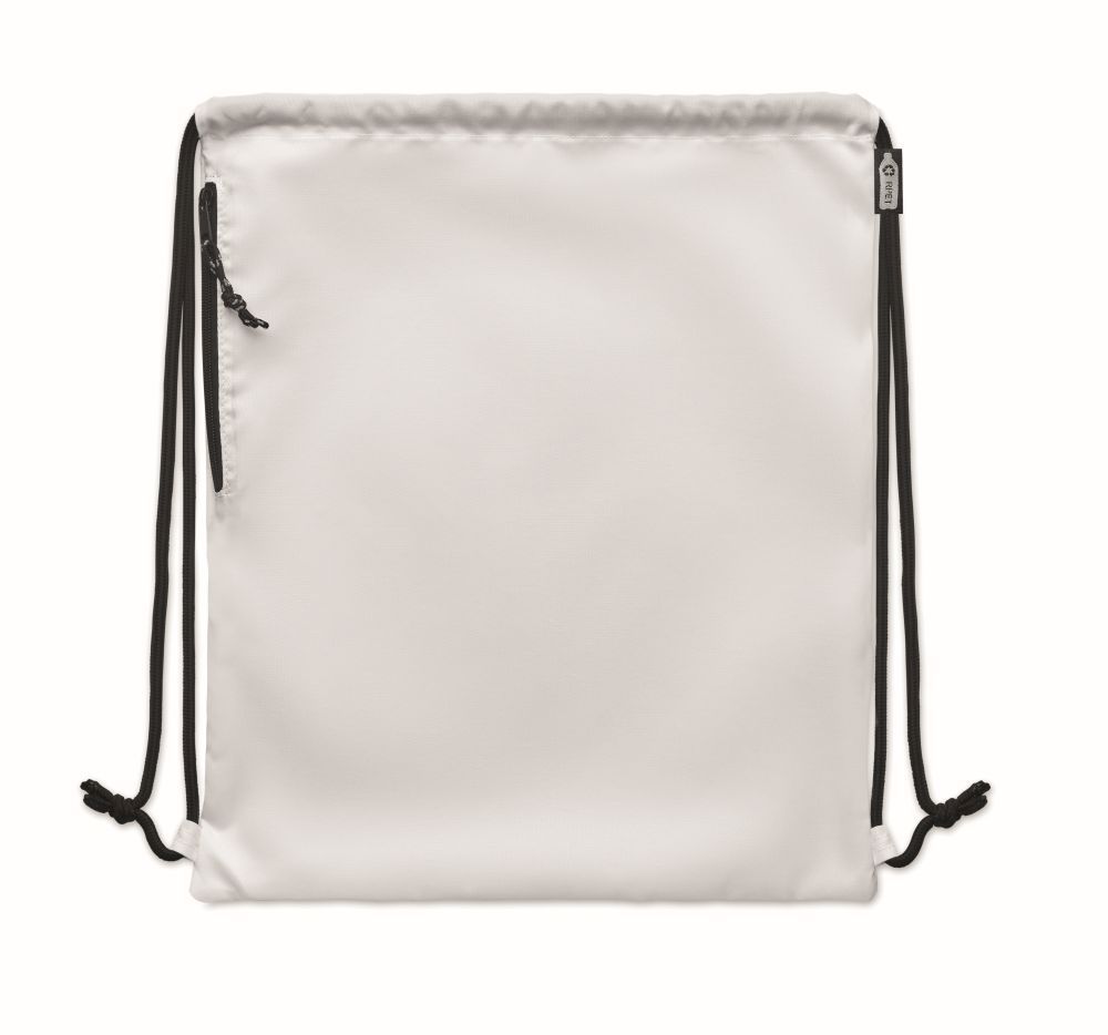 Large drawstring bag in 300D RPET polyester with side zippered outer pocket.