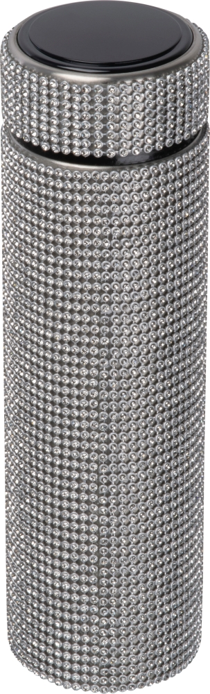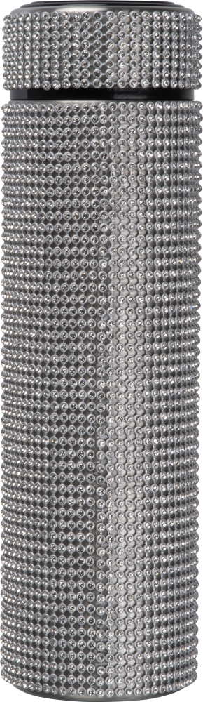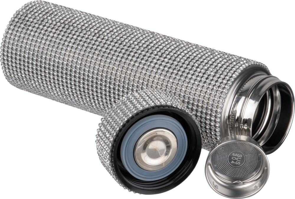 Double-walled vacuum drinking bottle made of stainless steel with sparkling rhinestone accents, a capacity of 500ml, strainer insert and a leak-proof screw cap. We will engrave your logo on the lid. Dimensions: o 6,8 x 24 cm