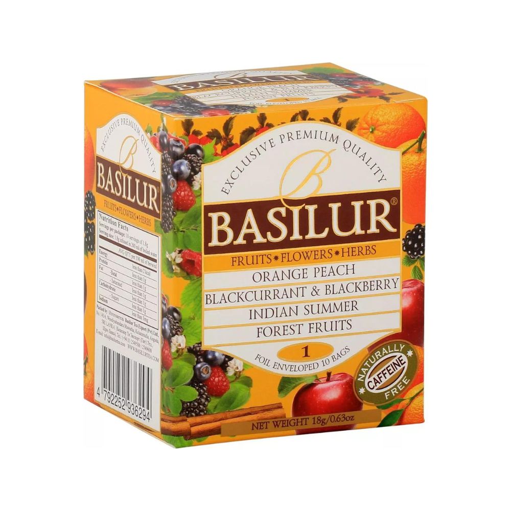 A selection of portioned Basilur teas in a box from Sri Lanka. Variation of flavored fruit teas, portioned. Recommended printing technology: complimentary. Dimensions: 6.7 x 8.1 x 5.6 cm.