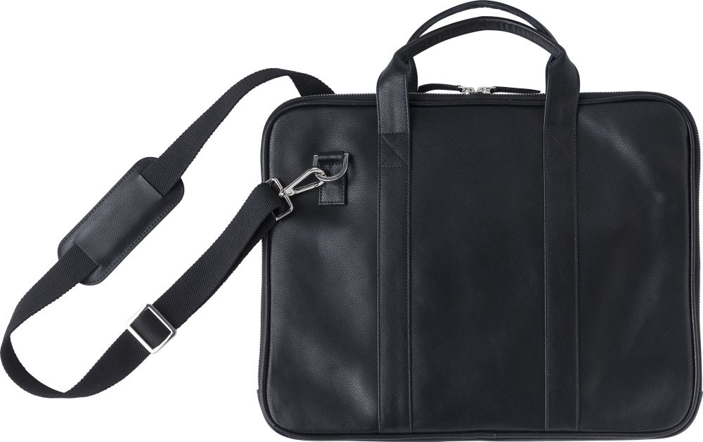 Leather laptop bag (15-inch) with zipper. The bag has multiple inside compartments: 4 pockets, one compartment with a zipper, and one compartment for a laptop with Velcro. It features two short leather handles and one nylon adjustable shoulder strap.