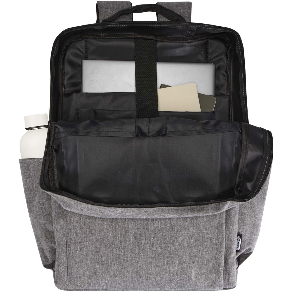 The Libra backpack is made from GRS certified recycled polyester and RPET lining, and it features a 15” laptop compartment with an additional padded tablet pocket and organisational pockets inside. There are also multiple pockets on the outside, padded and adjustable shoulder straps, and a trolley strap on the back. Resistance up to 10 kg weight. Dimensions: 33,5 x 45 x 10 cm