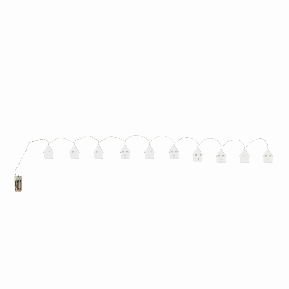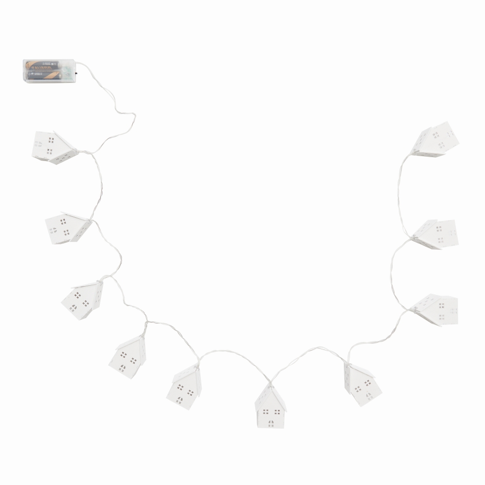 bLight chain COSY LIGHTS/b: approx. 168 cm long, each of the 10 wooden houses is illuminated with a warm white LED, timer function (6 hours on, 18 hours off), battery-operated (2x AA batteries not included). Dimensions: cca 6 x 5,5 / 168 cm