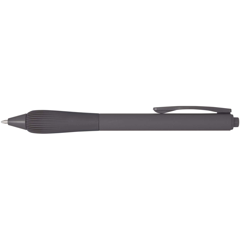 Recycled plastic ballpoint pen with a rubberized barrel, and grip made of TPR. Ink colour: Blue. Writing length: 1000 metres. Nib size: 1.0 mm. Dimensions: 14,3 x O 1,02 cm
