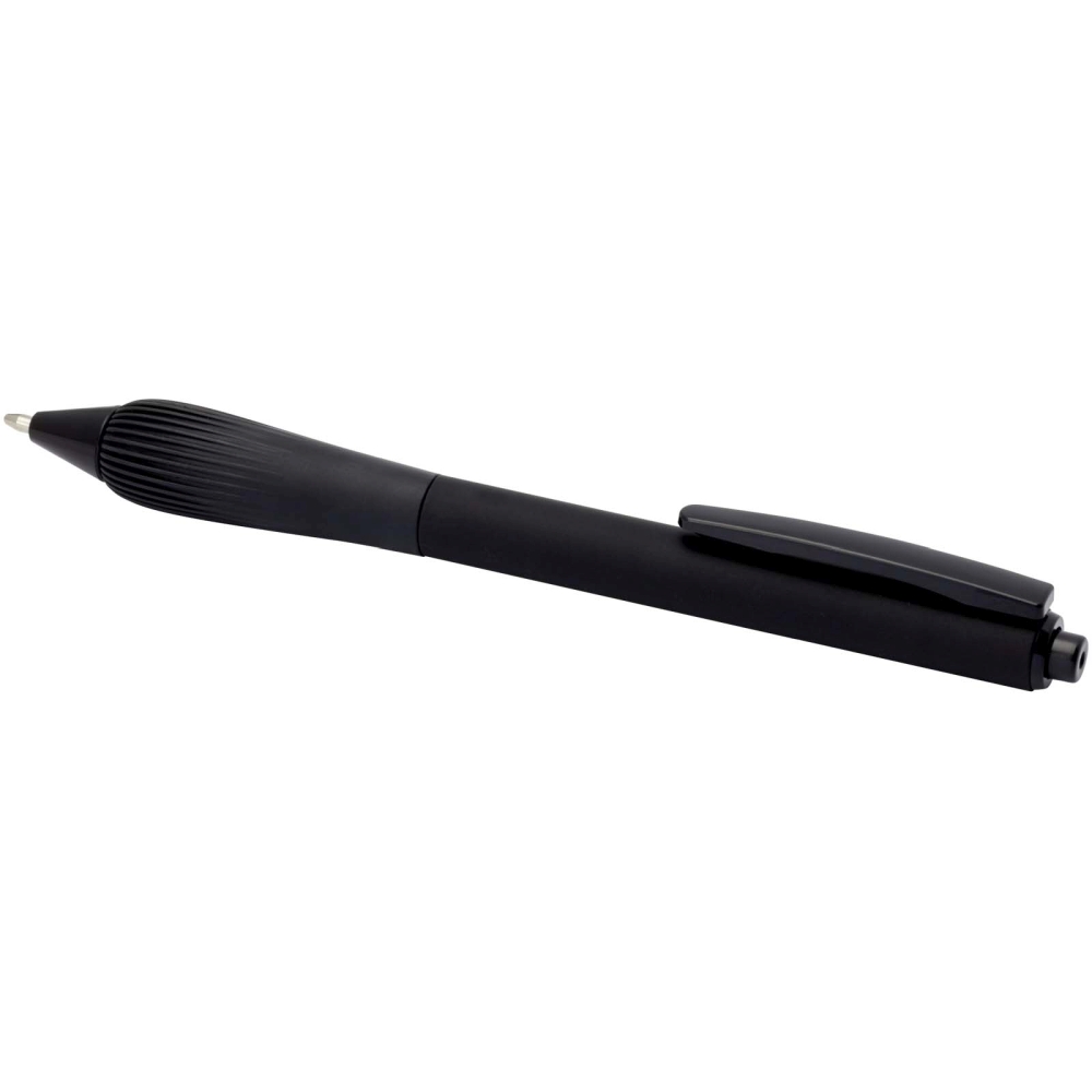 Recycled plastic ballpoint pen with a rubberized barrel, and grip made of TPR. Ink colour: Black. Writing length: 1000 metres. Nib size: 1.0 mm. Dimensions: 14,3 x O 1,02 cm