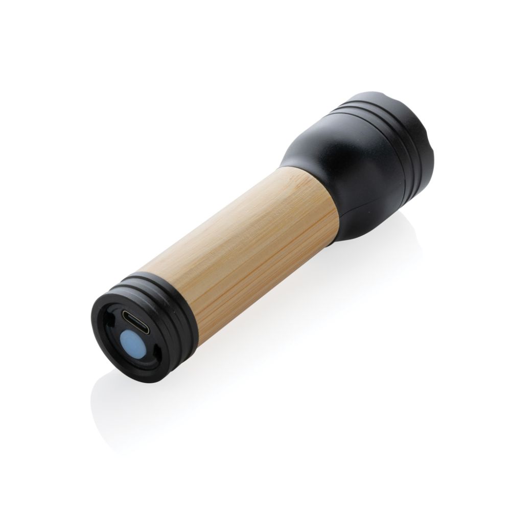 USB rechargeable 1W torch made with FSC® 100% bamboo and RCS (Recycled Claim Standard) certified recycled ABS. Total recycled content: 23% based on total item weight. RCS certification ensures a completely certified supply chain of the recycled materials. The torch comes with 500 mah grade-A lithium battery. The torch can be operated up to 3 hours on one single charge and recharged via type c in 2.5 hours. The beam distance is 50 metres and provides 90 lumen. With 3 modes (bright, medium and flash). Including RCS certified recycled TPE charging cable. Packed in FSC® mix kraft packaging. Item and accessories 100% PVC free