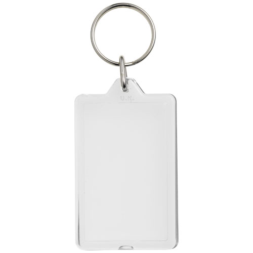 Clear rectangular G1 keychain with metal split keyring. This keychain is reopenable with a coin. The metal looped ring offers a flat profile which is ideal for mailings. Print insert dimensions: 5,0 cm x 3,0 cm.