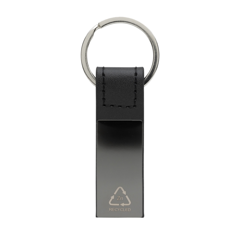 Luxury keychain made with RCS recycled zinc alloy and PU. Total recycled content: 67% based on total item weight. RCS certification ensures a completely certified supply chain of the recycled materials. Packed in paper bag. Dimensions: 6 x 2 x 0.4 cm