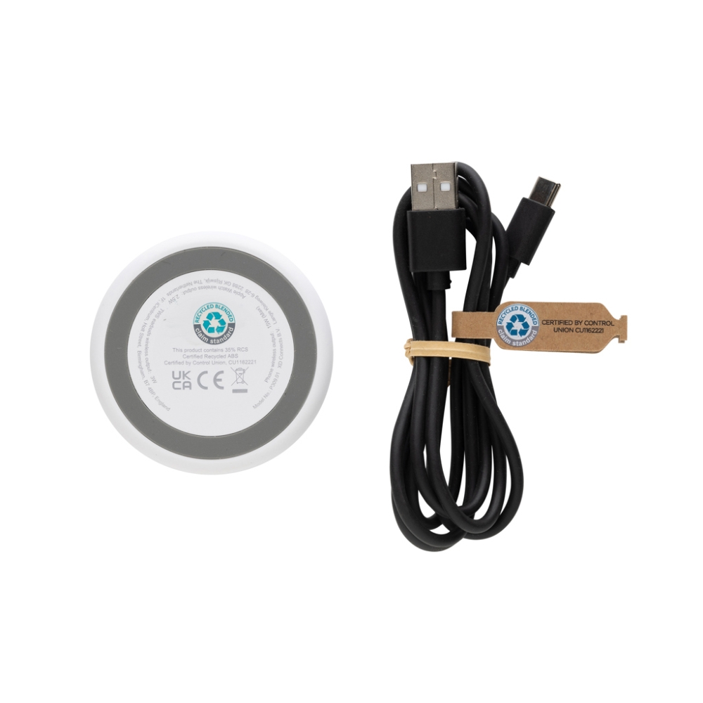 Unique design 15W magnetic wireless charger that gives you the option to charge either your mobile device, earbuds or iWatch. Simply click them on and start charging. Made with recycled ABS and recycled TPE. Total recycled content: 35% based on total ite