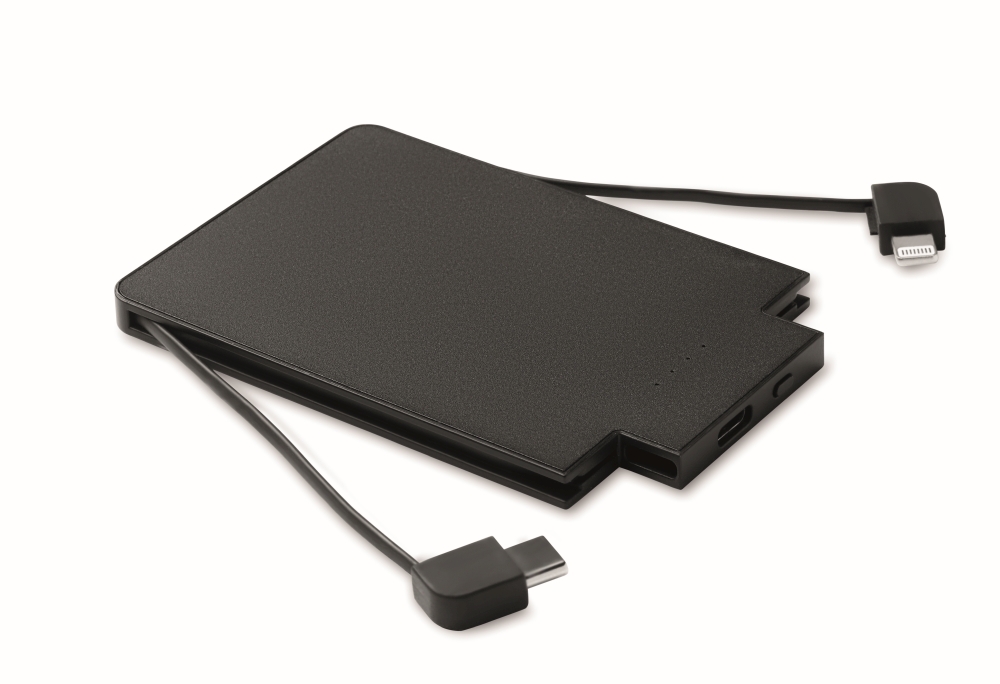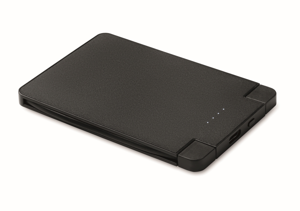 Card sized power bank 2500 mAh capacity in ABS with built-in cables. Powerbank sticks to magnetic featured iOs phones. Input: Type-C and output Type-C and IOS devices compatible. Dimensions: 9,8 x 6,5 x 0,6 cm