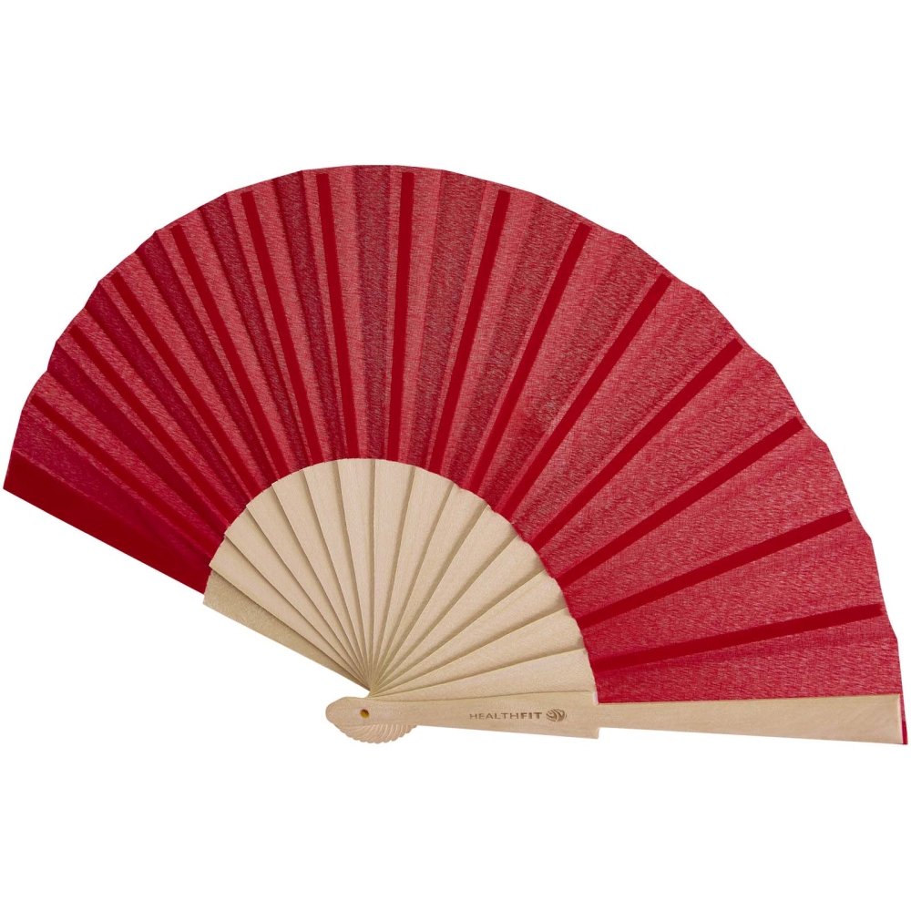Hand fan made from wood and polyester, available in a wide range of colours. Dimensions: 23 x 41,5 cm