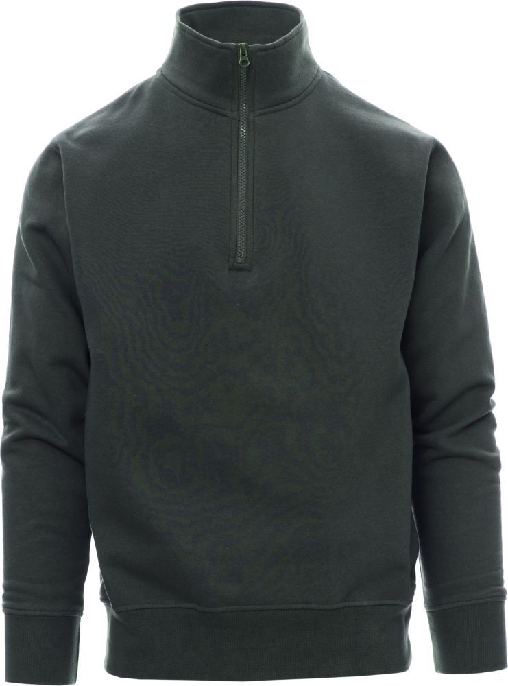 Men’s sweatshirt with matching half zip in plastic with metal pull, fitted sleeves, stretch rib cuffs and hem, reinforced seams. 70 % cotton a 30 % polyester, 280 gsm.