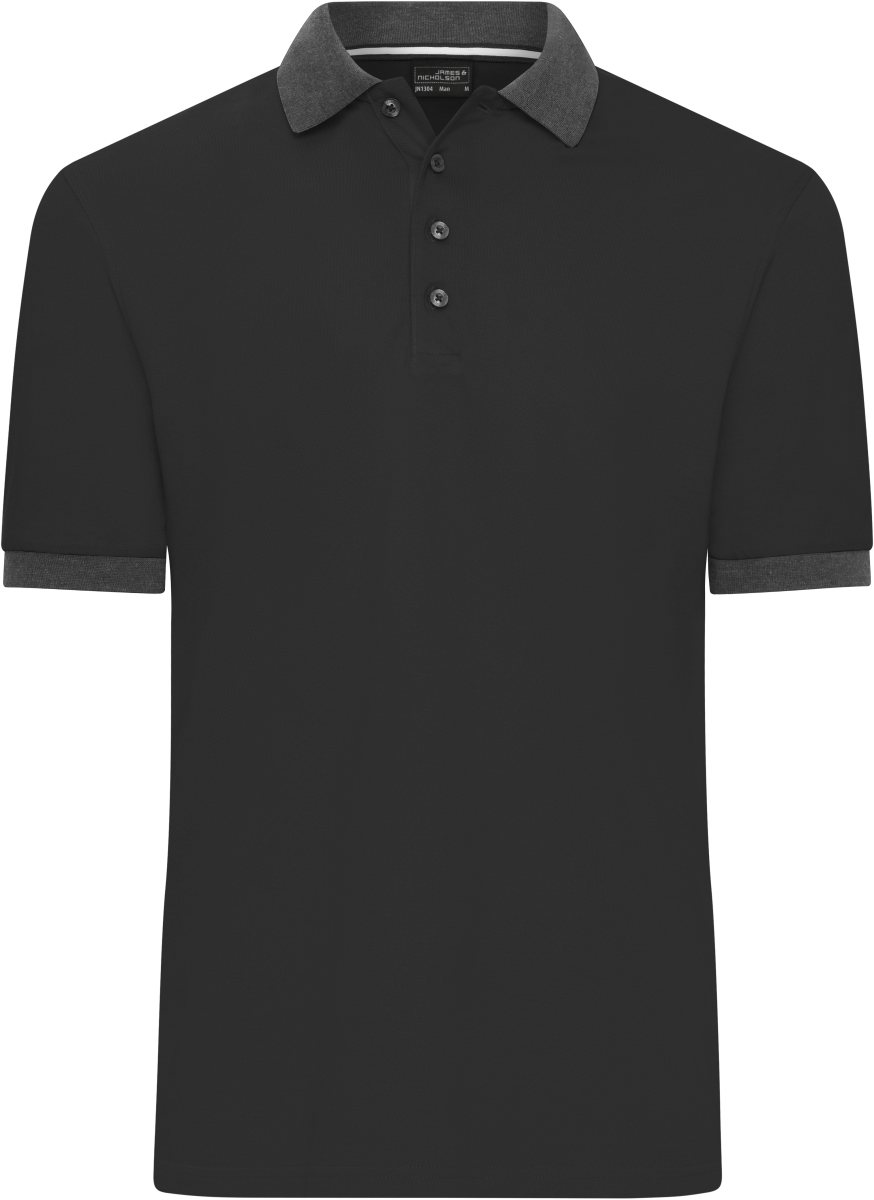 18 button-placket, necktape in contrasting color, knitted polo collar and cuffs in black color, side slits. Material: 195g/m2, 100% combed ringspun cotton.