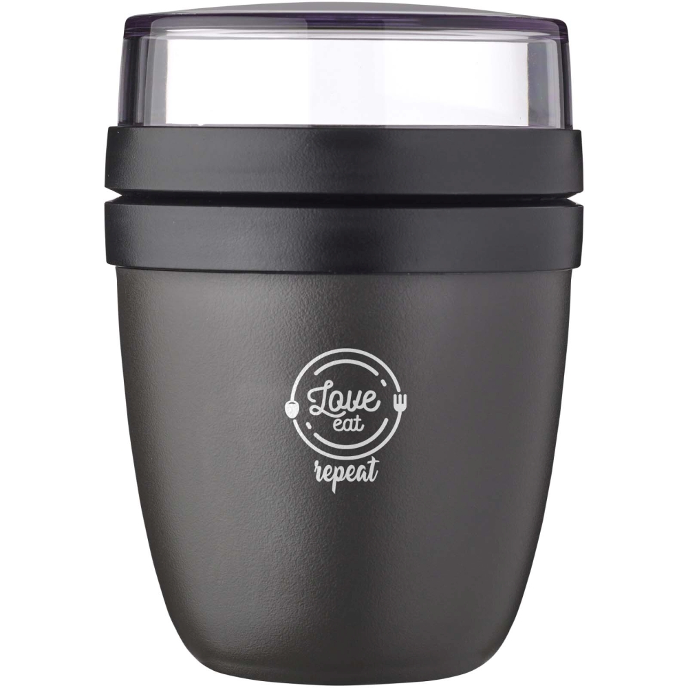 The Ellipse Mini lunch pot is perfect for a variety of snacks, such as yogurt with muesli or soup with croutons. Featuring two smart compartments in one sturdy container, it keeps your ingredients neatly separated. Its compact size makes it ideal for easily fitting into a school bag for a quick, convenient meal. The top transparent container holds 120 ml, ideal for around 50 grams of muesli or fruit, and the bottom container has a capacity of 300 ml. Leakproof and dishwasher safe. BPA free. Dimensions: 12,8 x O 9,1 cm