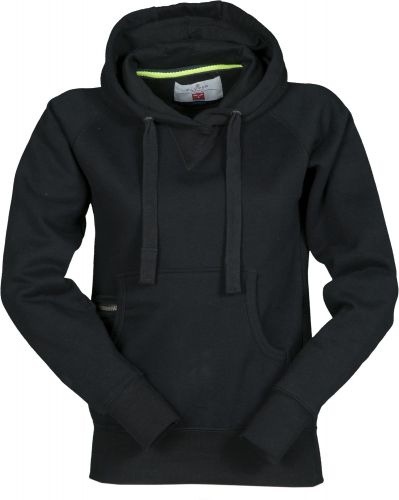 Women’s fitted hoodie with double stitched seams and white drawstring with contrasting stitching and metal rings, raglan sleeves, V-design neck stitching, kangaroo pockets, small zip pocket, stretch rib cuffs and hem, reinforced seams, 300gr/m2. Material 70% bavlna, 30% polyester.
